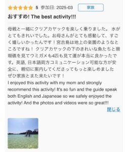 前回はクリアカヤックをしてくださり、こんな嬉しい口コミを投稿。